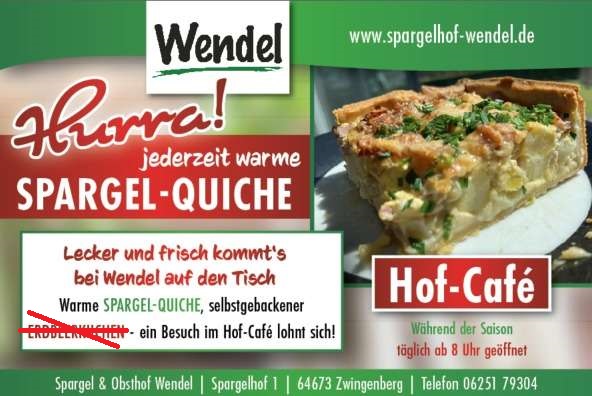 Wir vom Spargel & Obsthof Wendel bieten Ihnen während der Saison von April bis Juni Spargel, Erdbeeren und Himbeeren aus eigenem Anbau. Außerdem erhalten Sie bei uns im Hofladen eine große Auswahl an hausgemachten bzw. regionalen Produkten wie Fruchtaufstriche, Weine, Landschinken etc.